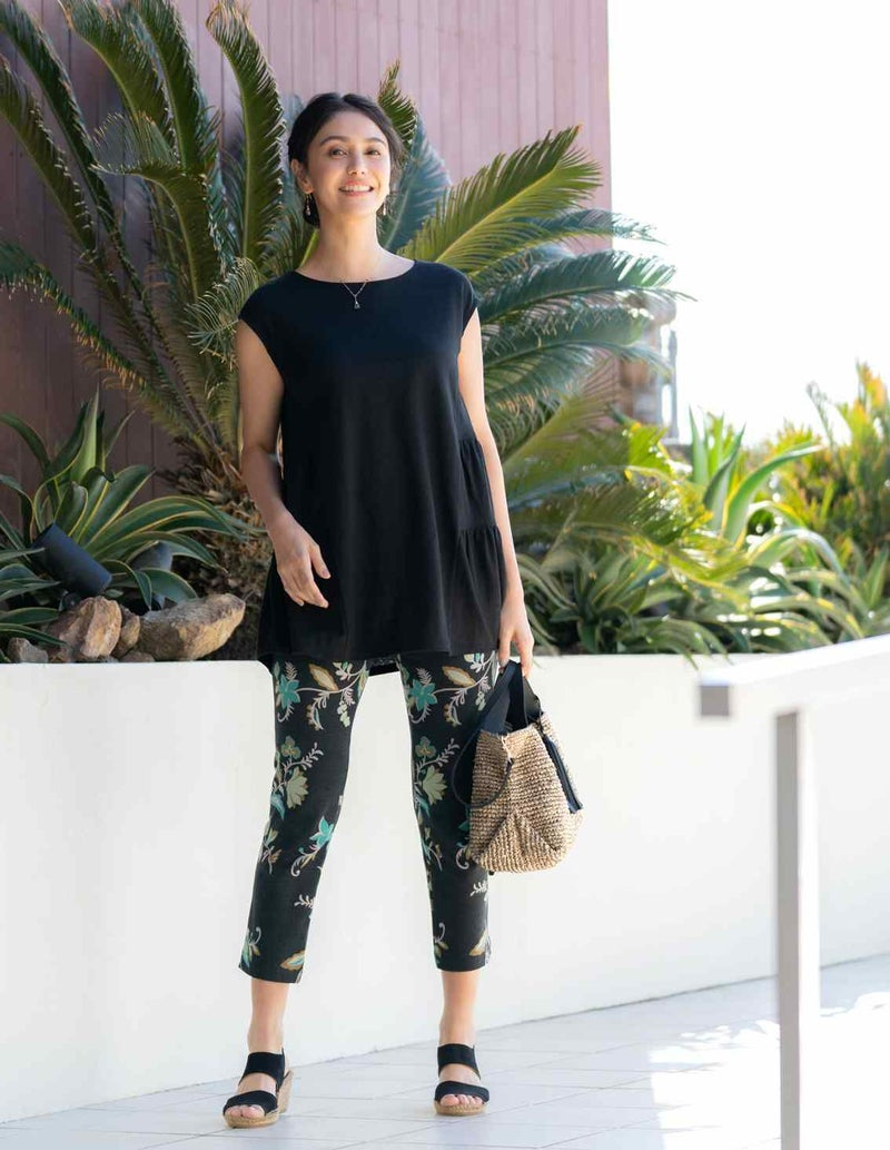 サラサ調の花柄が、つたのように描かれた上品な柄。両脇に小さなスリットの入った定番スッキリシルエットの定番 9分丈パンツ。後ろにパッチポケットが付いています。
