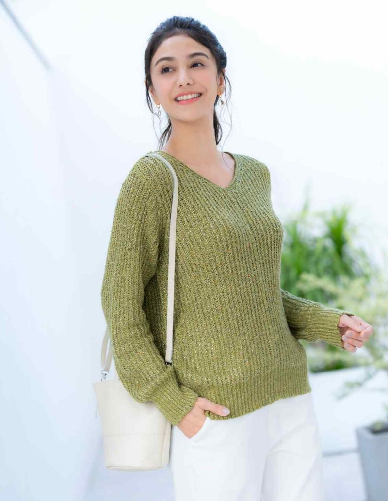 ■スタッフコメントななこ・身長159cm・49kg・標準体型 普段、スポーティフのトップスは2サイズ、パンツは2サイズ。 [着用サイズ2] こだわりの詰まった糸でざっくりと編みたてられた大人っぽさを感じるニット。シャープなVネックでお袖丈は手の甲の中ほどまでありました。繊細なラメ糸がシンプルなニットをおしゃれに引き立ててくれます。アクセサリーなど引っ掛かりにはご注意ください。