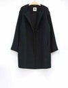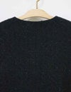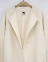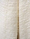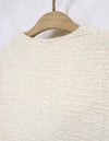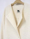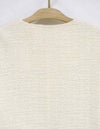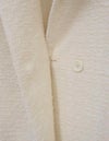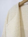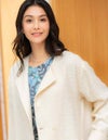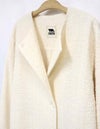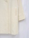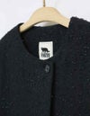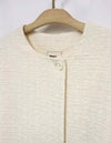 黒とアイボリーのベーシックな2色展開。上品な華やかさのあるツィード素材です。 ドロップショルダーでアームホールも広めの作りでゆったりとしたサイズ感。インナーが厚めでも羽織りやすいです。 ウエストのボタン位置の打ち合わせは深めで、内側に隠し1ボタンを施しています。 衿元のボタンを留めるとプレーンなクルーネックになったり、印象の変化を楽しめます。 袖口は折り返してカフス風にも調節できます。裏地付き。