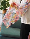 顔周りを明るくしてくれる華やかさ、イタリアらしい色彩センスを感じる色使い、カラフルな花柄がフェミニンな女性らしさを引き立ててくれます。肌が艶めくなめらかさ。印象に残るアートのように美しいストールです。