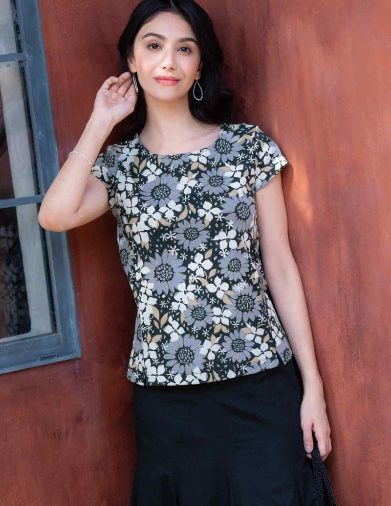 夏らしく色も華やかで大き目な花がSPORTIFFらしいひまわり柄です。前身頃のパネル切り替えで、ボディラインが綺麗に見えます。パネル利用のスリットがデザインポイントの半袖プルオーバーです。