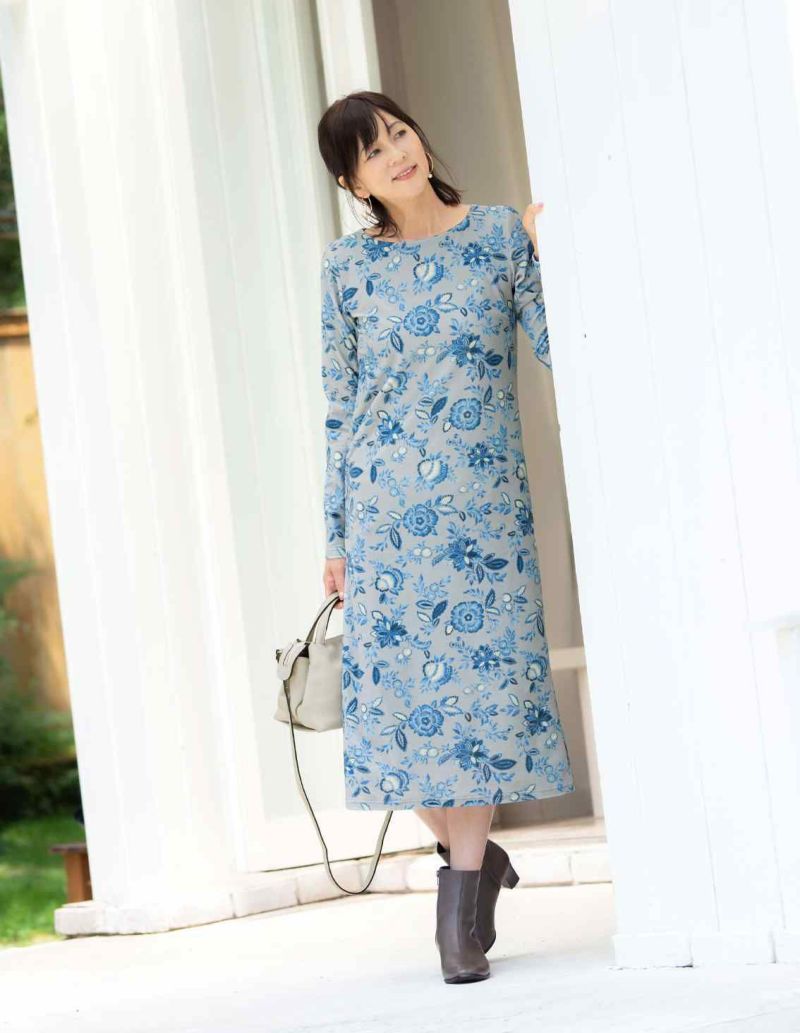 水彩タッチで表現されたスポーティフらしいサラサ風の花柄です。ボートネックのシンプルな長袖ワンピースです。