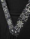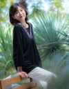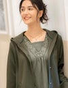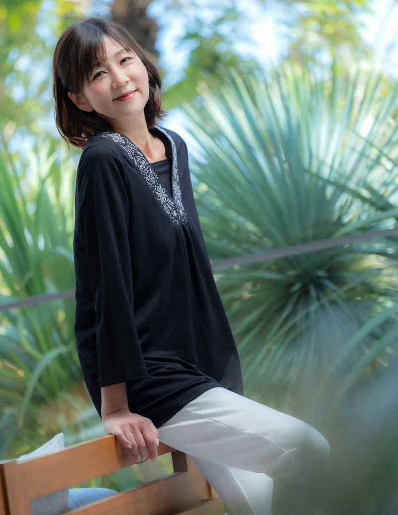 襟元に刺しゅうを施した、華やかな印象のチュニックは、胸元に当て布があり1枚で着用が可能です。裾にかけて程よくフレアになっており体のラインを拾いません。刺しゅうはオリジナル柄です。