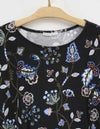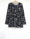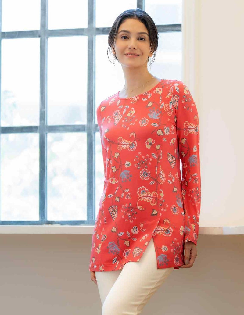 ■スタッフコメントななこ・身長:159cm・体重49kg標準普段、スポーティフのトップスは2サイズ、パンツは2サイズ[着用サイズ2]薄手で伸びのあるベア天竺素材。鮮やかな色柄が印象的です。前身頃プリンセス切替を利用した左裾スリット入りです。お袖口内側にもミニスリット入り。ヒップすっぽりカバー丈。