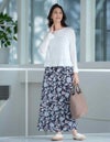 レーヨンのソフトな風合い、光沢感、ドレープ性を残しつつ、形態安定性に優れ、肌触りの良い素材です。サラサ風の花柄にストライプ柄が入り春らしさを感じる柄です。前と後ろに切り替えの入ったややフレアーのロングスカートです。前ベルト側にはギャザーをなくし、気になるお腹まわりをスッキリとみせるシルエットです。