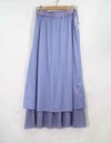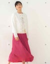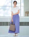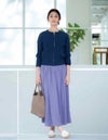 割織糸(かっせんし)と言う繊細で滑らかなタッチを表現できる糸を使用している生地です。上品な光沢とシルクのような軽さが特徴でイージーケアにも富んだ素材です。落ち感がある素材で腰回りのボリュームが抑えられ、軽やかさを出したウエストゴムのギャザースカートです。ベルトを折り返してもトップスをインできるウエスト仕様で、丈のバランスを変えることが出来るうれしい1枚です。
