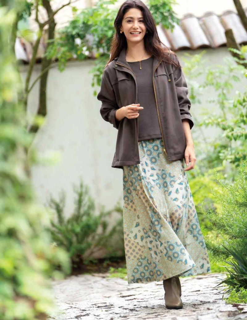 フォークロアー調の柄を組み合わせた、タイルのような雰囲気の柄です。腰回りがスッキリと見え、裾に向かうフレアーはマチが入っているので、大人の女性らしいシルエットのロングスカートです。